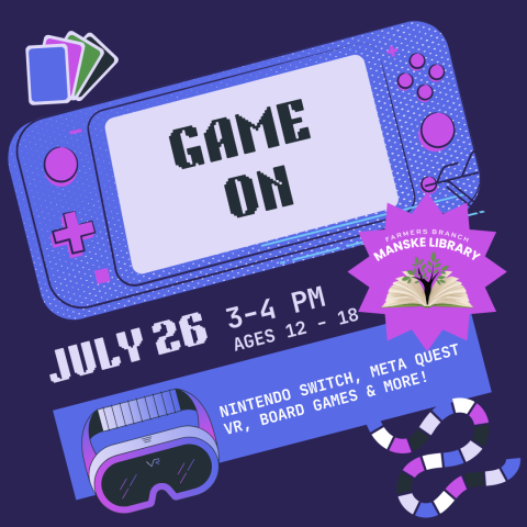 This event is in the "Teens" group Teen Game Night Tuesday, January 6, 2026 at 4:30pm - 5:30pm The Hub at Farmers Branch Manske Library Program Type: Arts, Crafts, & Hobbies Age Group: Teens Enjoy an afternoon of gaming at the library! Play our Nintendo Switch, Meta Quest VR, plus board and card game favorites. Ages 12 – 18. View Details